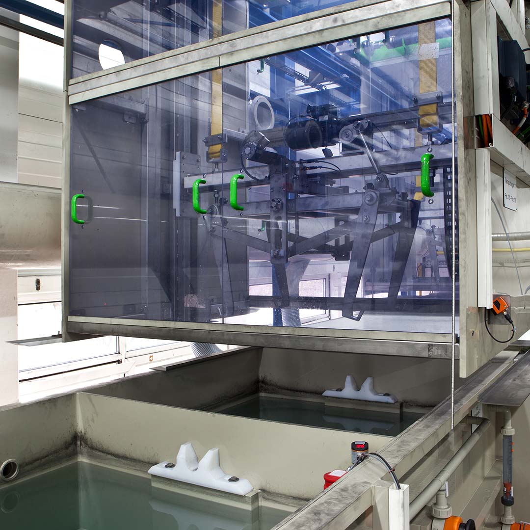 Die Anlage ist maßgeschneidert für beengte Platzverhältnisse und kombiniert zwei Linien mit einer effizienten, klar strukturierten Warenlogistik. Transportwagen mit integrierter Kippeinrichtung sowie separate Rissprüfkabinen gewährleisten eine sichere und prozessstabile Bauteilhandhabung.