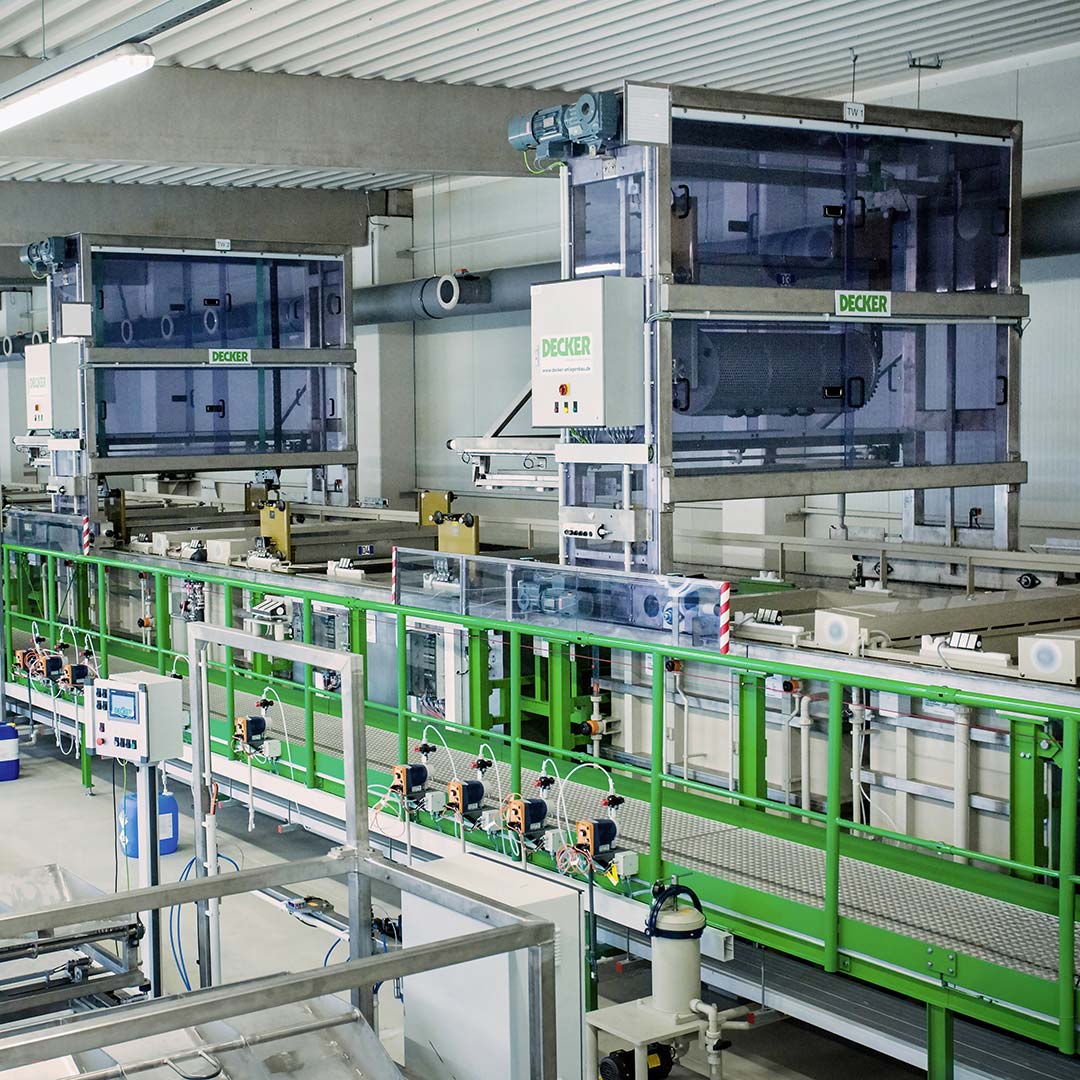 DECKER entwickelte eine kombinierte, vollautomatische Anlage zum Entfetten, Spülen und Beizen mit anschließender Phosphatierung oder nanokeramischer Beschichtung von Bauteilen aus unterschiedlichen Materialien.